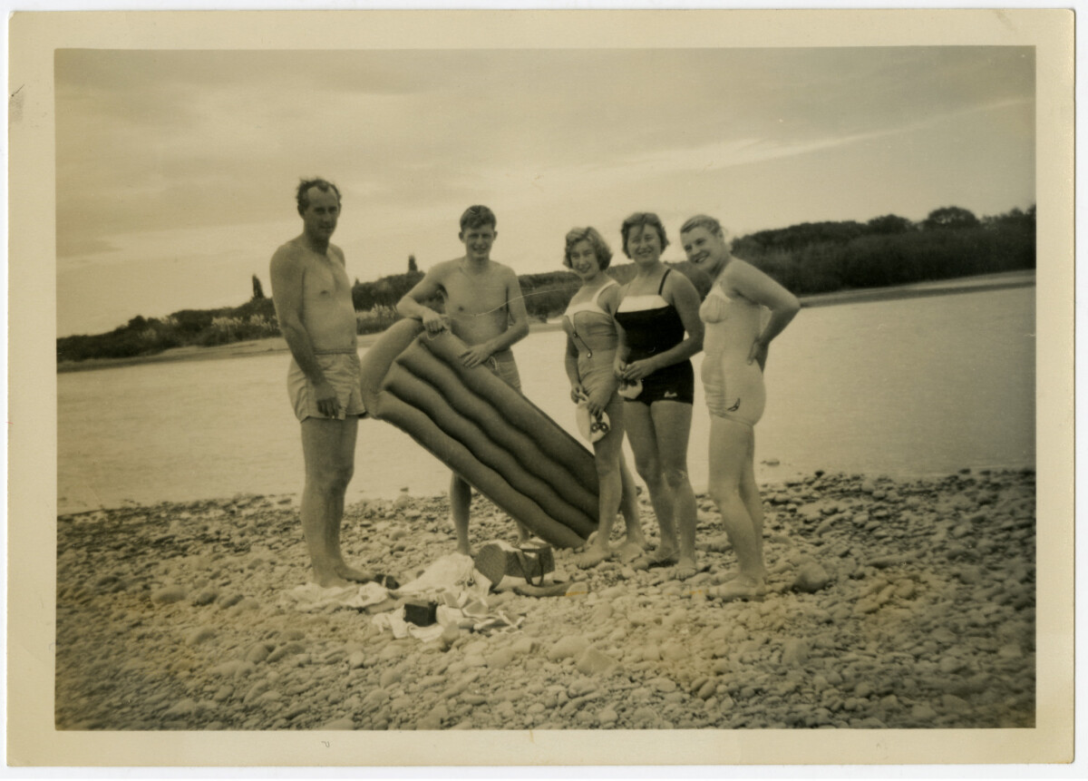 Summer Sunday outing at the Waimakariri River. In this 1958 the daughers of Jim & Venis are more adventurous with the lilo for venturing on the river. Bain, Peter, Avis, Merle & Brenda.