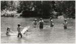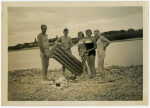 Summer Sunday outing at the Waimakariri River. Bob, ?, Ruby, Venis, Jim with the dinghy on the river. Jim is holding the anchor.