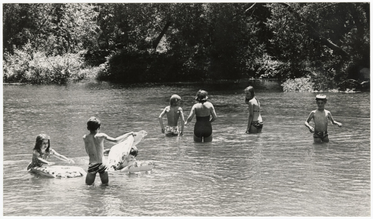 A group of adults and children swimming in a branch of the Waimakariri River at the Groynes in Northwood.