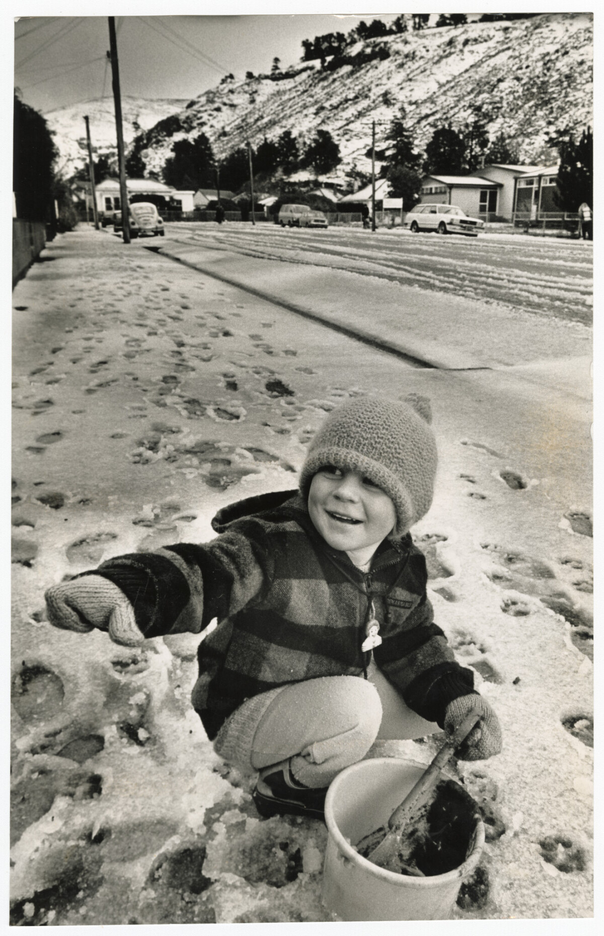 Julie Brookes playing in the snow with a bucket and spade on Hardwicke Street in Sumner.