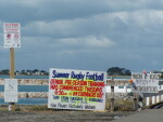 Signs for Sumner Rugby Football and celebrating a local wedding attached to fencing along Main Road to Sumner.