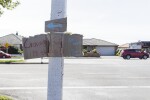 Garage sale sign on a post at the exit of Bishopdale Village Mall onto Harewood Road.