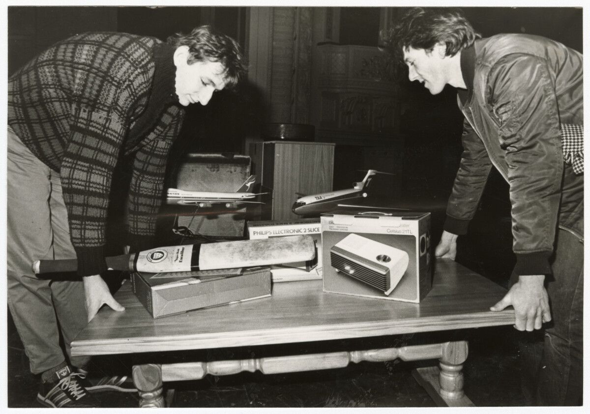 Festival organisers John Page (left) and Robin Neate delivering goods to the Theatre Royal be auctioned in a live show as part of the Christchurch Festival. Goods include a portable heater, aeroplane models and a cricket bat.