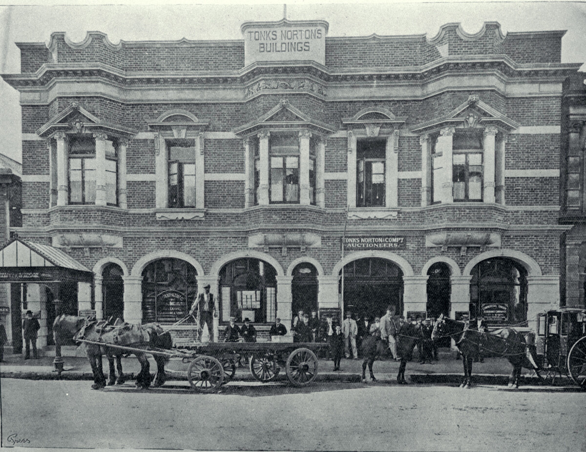 At the time this was considered to be one of the most handsome buildings in New Zealand. Designed by Fred J. Barlow and W.A.P. Clarkson (1863-1917), it was built in a classic style of stone and brickwork with oriel windows on the first floor. Messrs. Tonks Norton & Co. were auctioneers