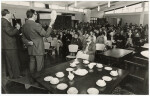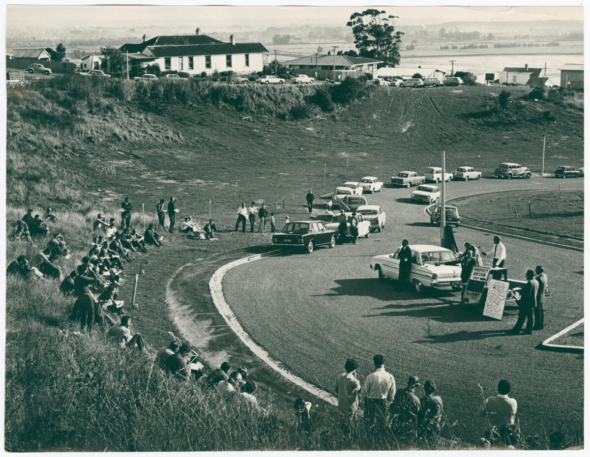 View along St Andrews Hill towards the Estuary and towards Bromley. In the foreground an auction of sections for sale is taking place, led by auctioneer Mr Denys Chapman. Crowds are sat along the bank next to their cars and the sections for sale.