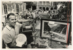 Harold Garlick, chairman of the Rotary Club community services committee, with items for auction at the Arts Centre. Stalls and visitors are shown in the courtyard area in the background.