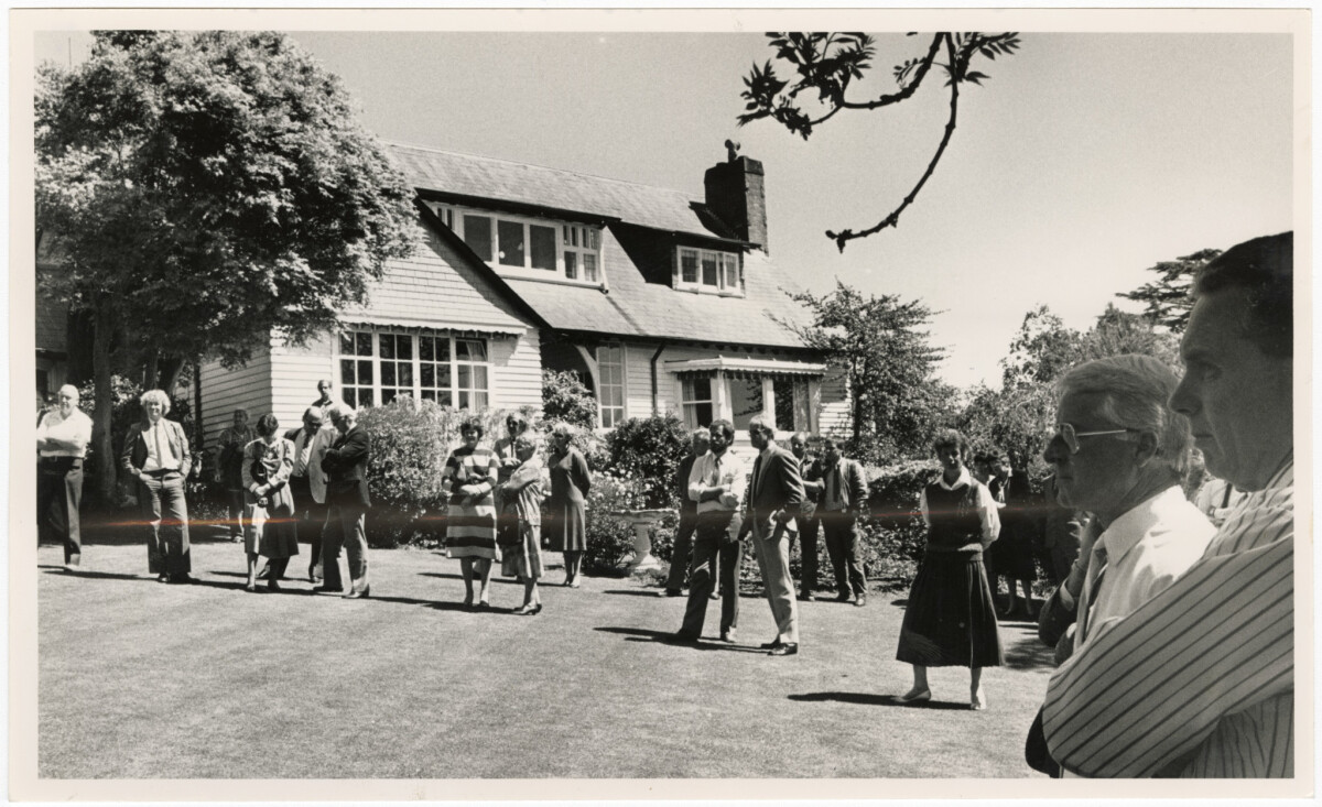 Exterior of Chellowdean house in MacMillan Ave, Cashmere with groups of people stood on the grounds during the Auctioning of the property. At the time the house was the most expensive house sold at auction, for $370,000.