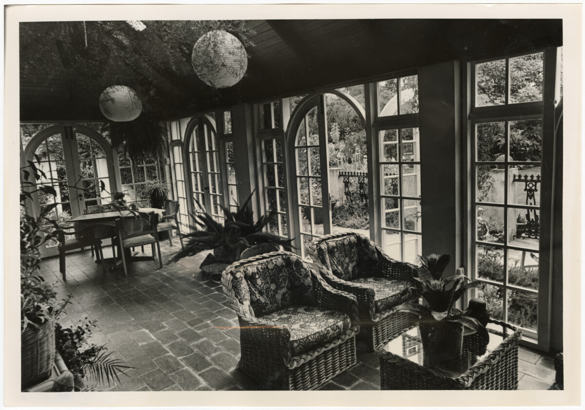 Interior of the slate floor conservatory at the home of Mr and Mrs Cooper on Wroxton Terrace, Fendalton. The house was designed by Helmore and Cotterill in 1929 and at the time of the photograph was to be auctioned.
