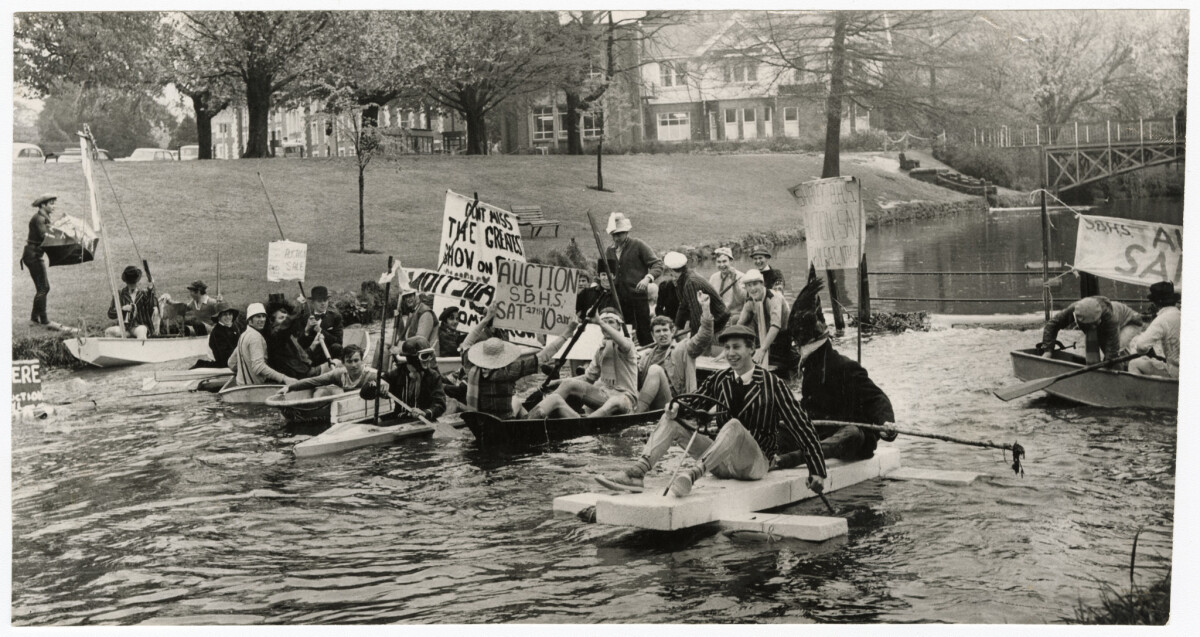 Shirley Boys' High School students on improvised crafts on the Avon River near the hospital. Also shown are signs for the school's auction.