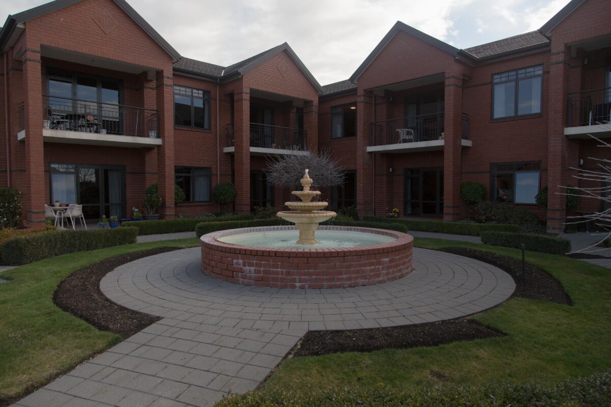 Exterior view of the garden area with a fountain at a retirement village in Aidanfield.