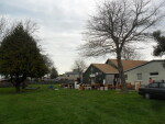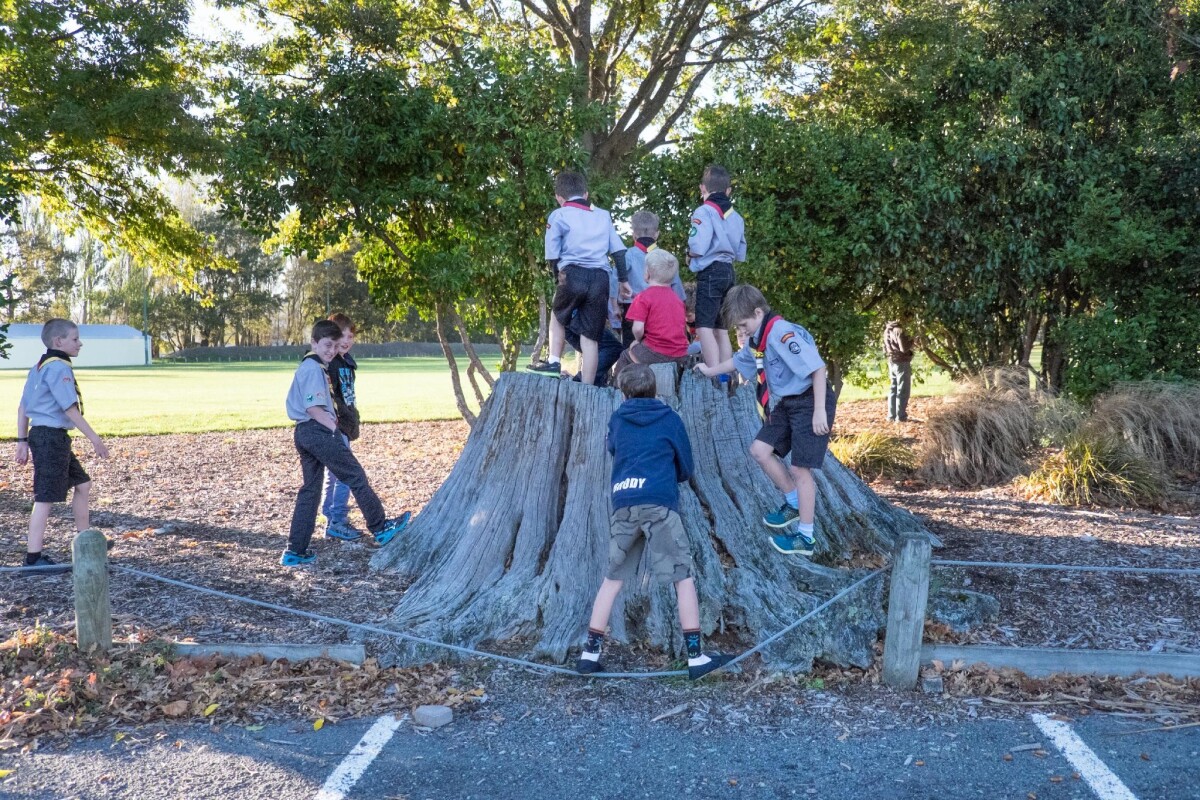 A group of Scouts in their uniforms playing on a large tree stump prior to the Anzac Parade at 301 Halswell Road.
