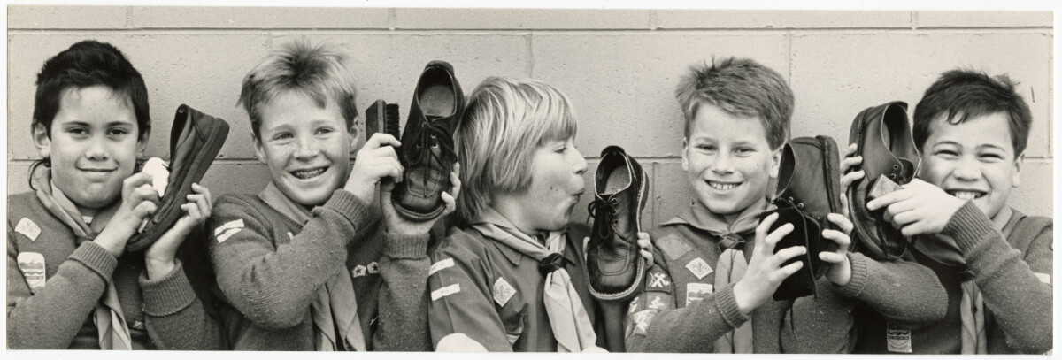 Hoon Hay cubs holding shoes to promote the free shoe shining service to shoppers they delivered at Hillmorton Shopping Centre, part of a campaign to recruit new cub members. Hoon Hay cubs pictured are (left to right) Dwayne Key, Timothy Brawn, Jonathon Gilliver, Kelly Day and Anaur Gray.
