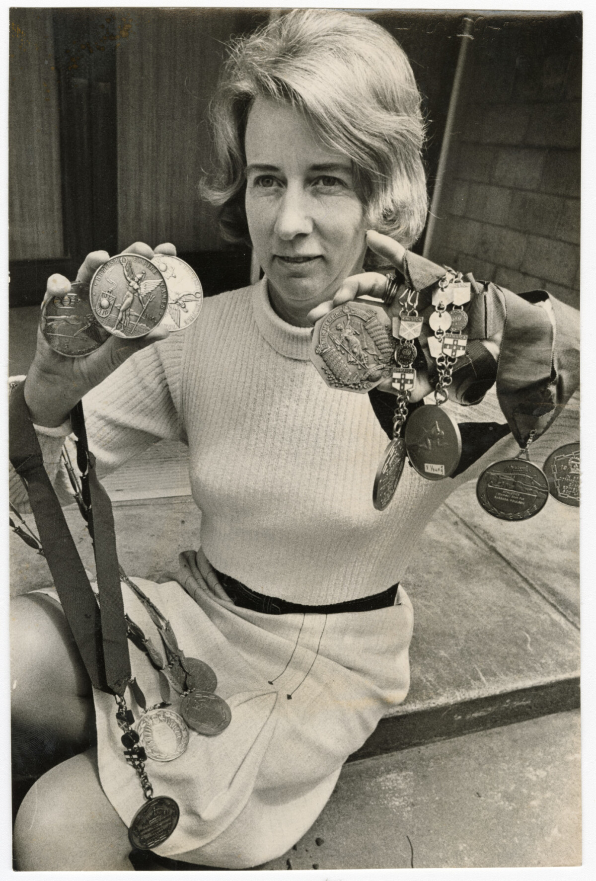 Mrs Joan Woodward holding a selection of Commonwealth Games medals which have been won through the years by Canterbury athletes. The medals formed part of an exhibition of items from past Games at the Canterbury Museum, organised by Mrs Woodward.