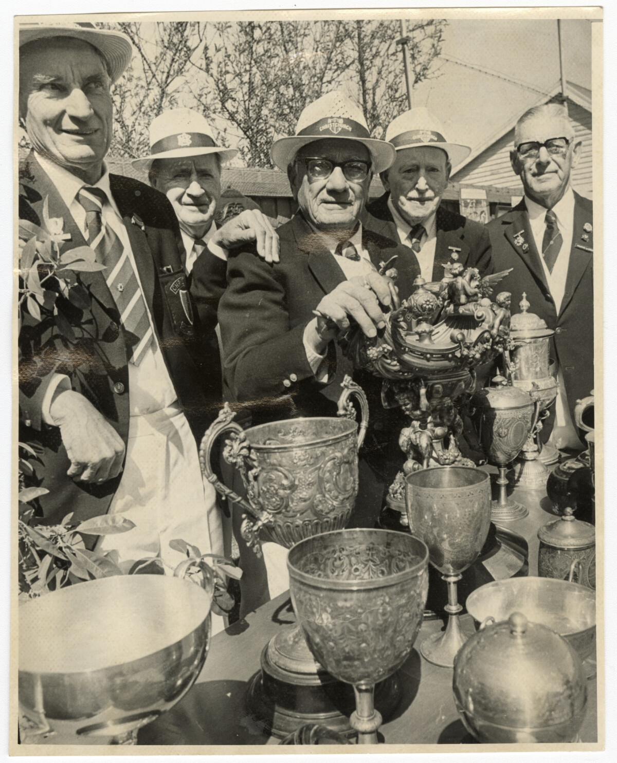 John Grigor, Roly Smith, Bill Clarke, Tony Tench and Maurice LeCren of the Christchurch Bowling Club with the New Zealand Bolwing Association Speights Cup.