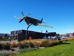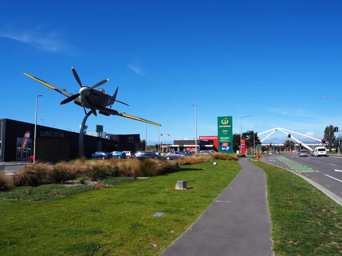 View of the Christchurch Air Force Memorial at Spitfire Square on Memorial Avenue near Christchurch Airport. Countdown Supermarket, McDonalds and the Memorial Avenue Gateway bridge are in the background.