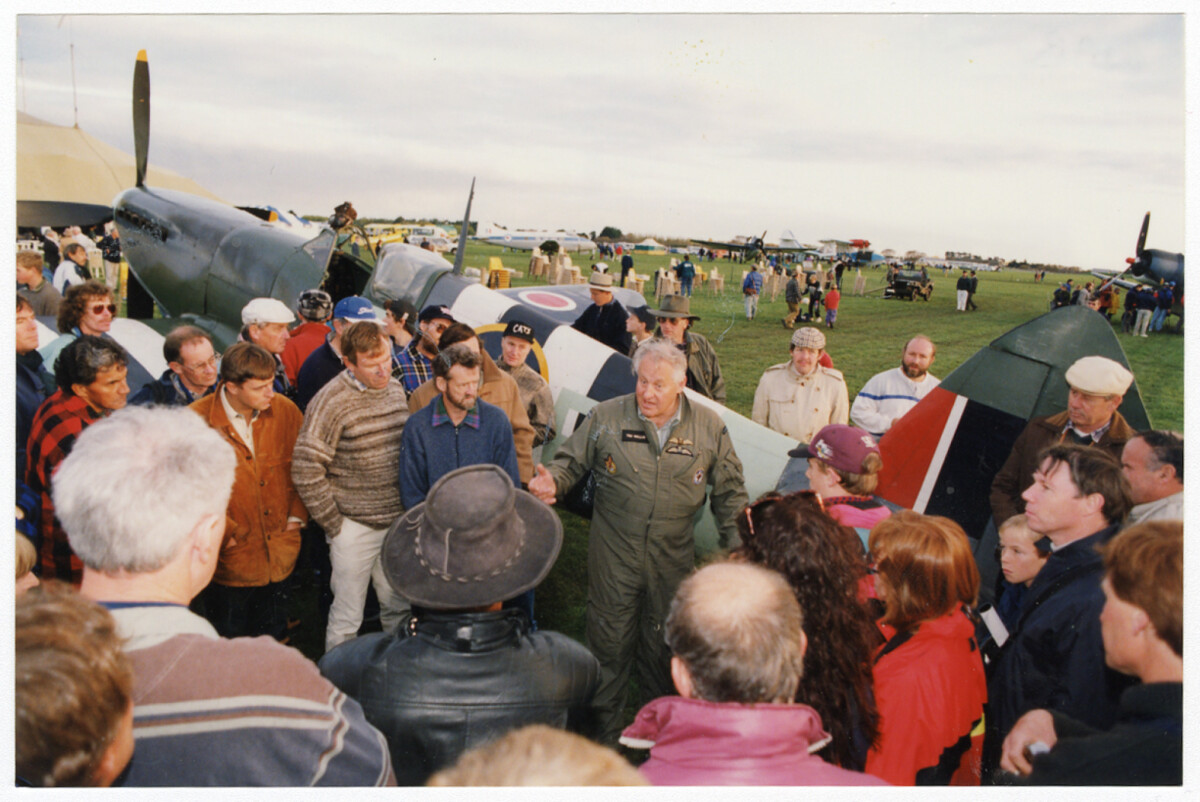 Tim Wallis stands next to his MK XVI Spitfire and talks to spectators at the Wigram air show.