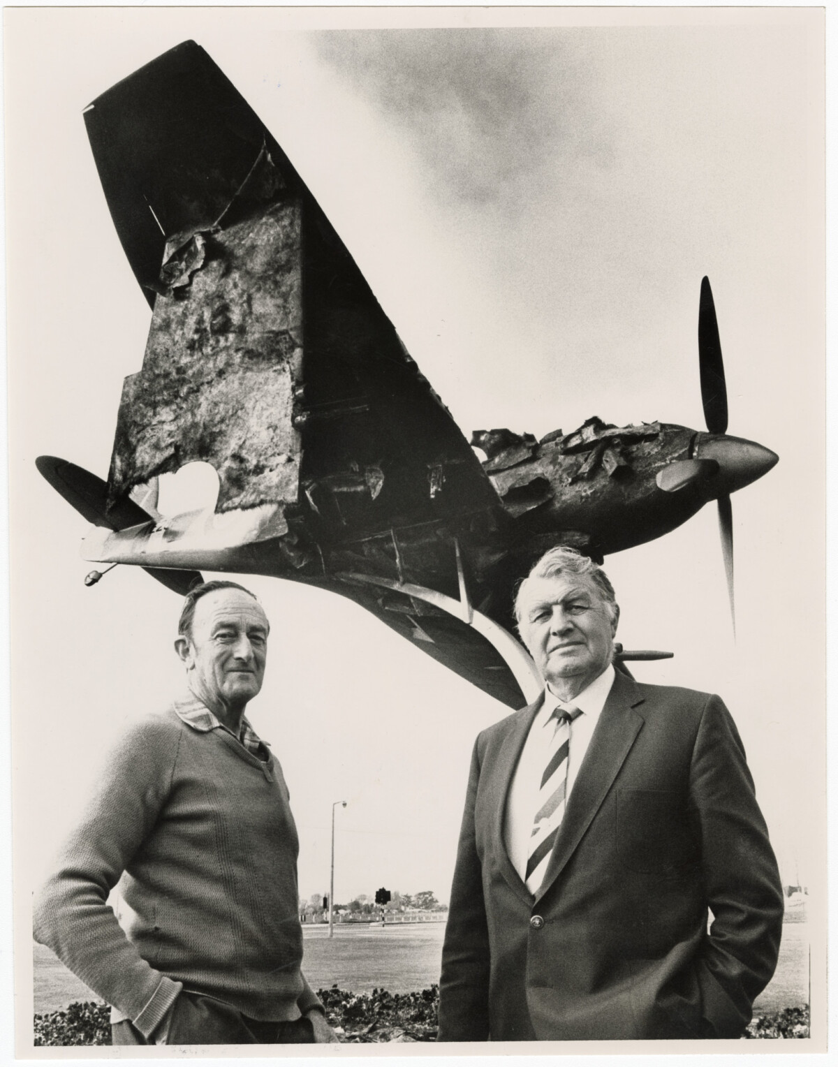 Ray Woodfield (left) and Owen Foster of the Brevet Club, standing beneath a burnt Spitfire that was vandalised on Memorial Avenue near Christchurch Airport.