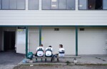 View towards three Halswell Hawks football players sat outside Club rooms after a game at the Halswell Domain.
