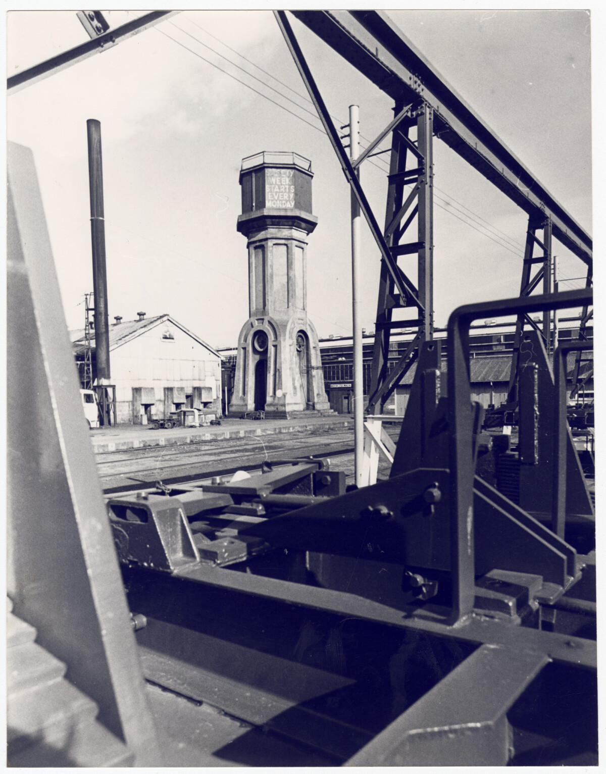 View of the Addington water tower on the roof of the Addington Workshops. The tower has been a landmark at Addington since 1883. 'Safety Week starts every Monday' is painted on the tower.