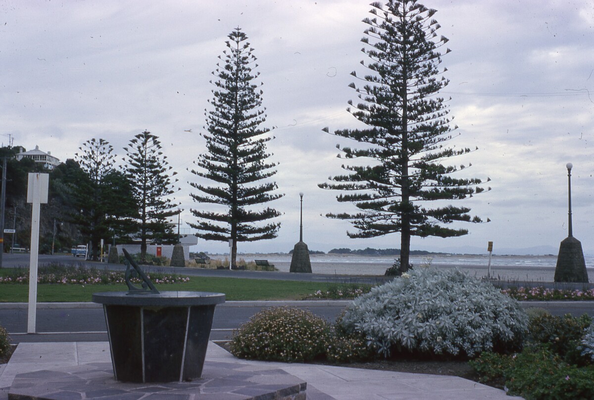View towards Sumner Beach, Sumner Surf Life Saving Club, Norfolk Island pine trees and Sumner War Memorial lamps. In the foreground is a sundial.