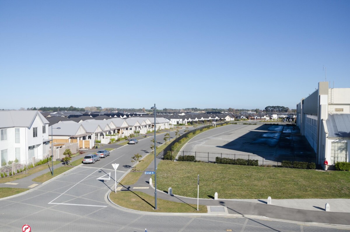 Wigram Skies housing development sits opposite an old RNZAF hangar. View looking south west down Sioux Avenue, Wigram Skies.
