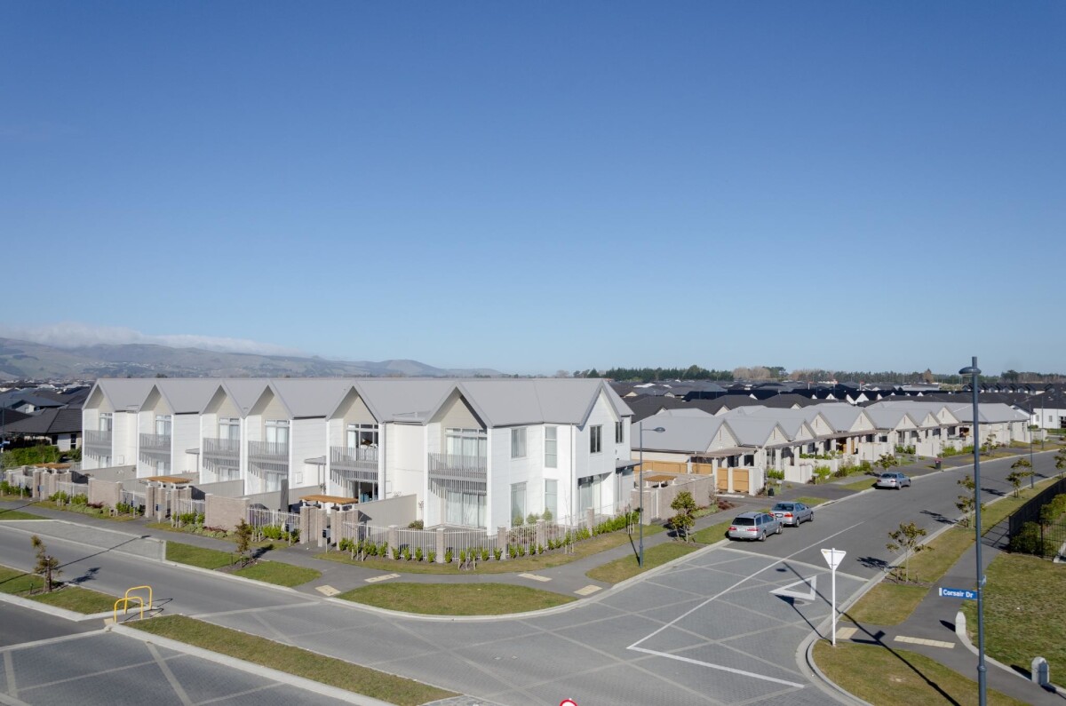 View down onto a new apartment block on the corner of Corsair Drive and Sioux Avenue, Wigram Skies.