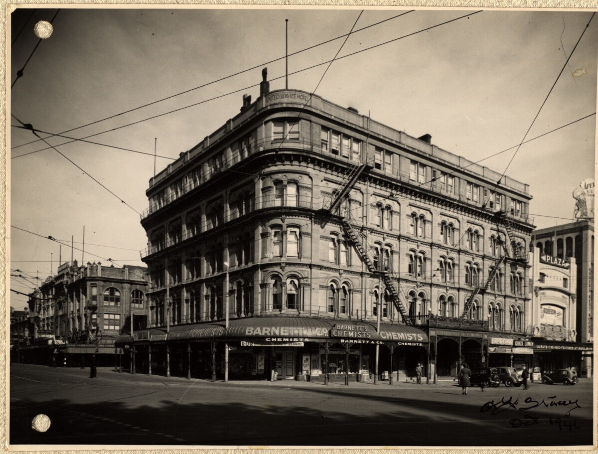 The United Service Hotel, previously known as Morten's Buildings, stood in the south-west corner of Cathedral Square, Christchurch. It was demolished in January 1990.