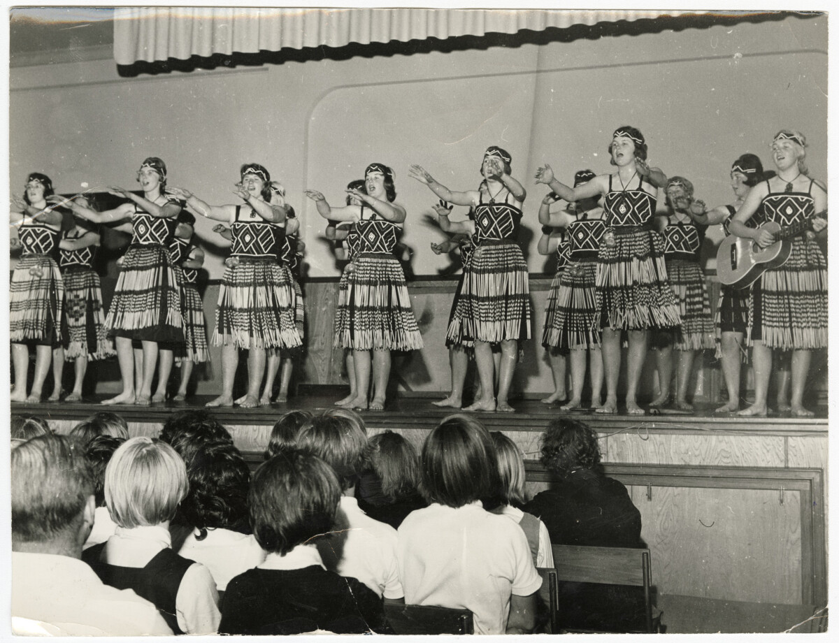 Members of the Māori Club on stage at Avonside Girls' High School performing an action song to friends of school and students.