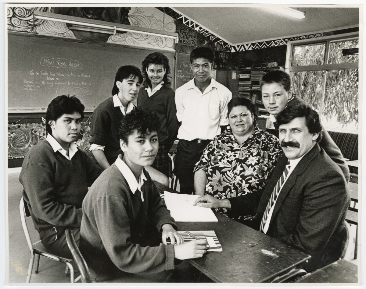 Group of students in a classroom at Aranui High School, part of a group learning in Māori and English. From front left, Charmaine Matehe, Jim Rogers, Earl Richard, Sheree Rangihuna, Ali Brown, Mrs Tihi Puanaki, Daniel Smith and Mr Graeme Plummer.