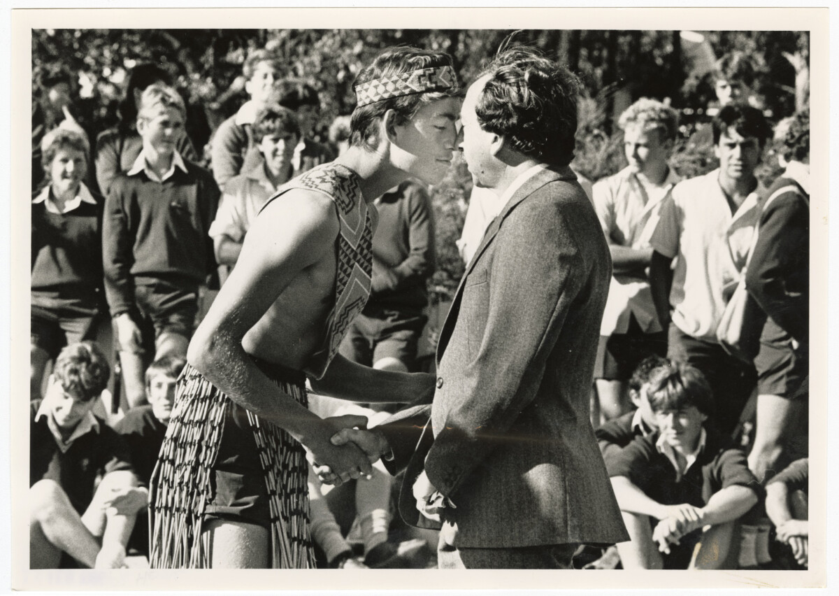 Nathan Boyd welcoming the new deputy head teacher Mr Rex Gibson, with a hongi to Aranui High School as part of a ceremonial welcome.