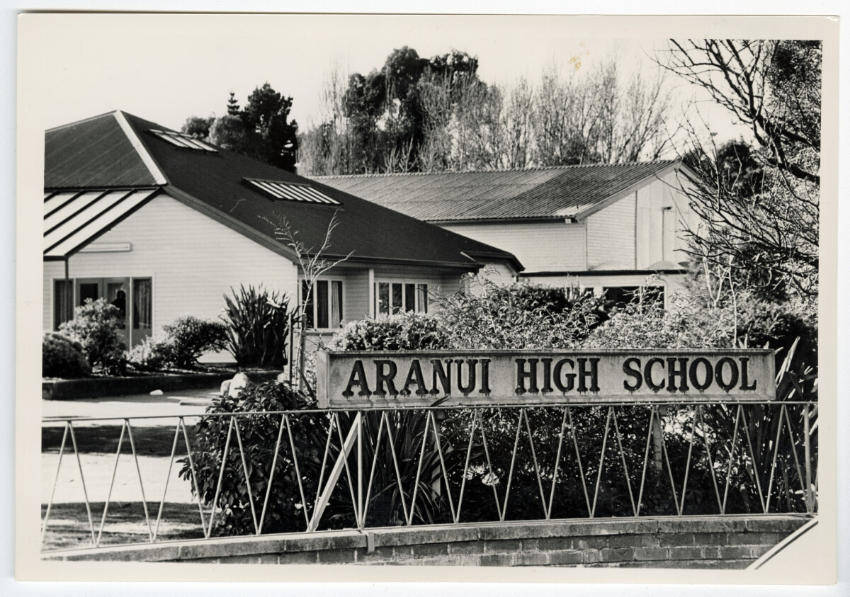 Exterior of the main entrance and sign for Aranui High School on Shortland Street.