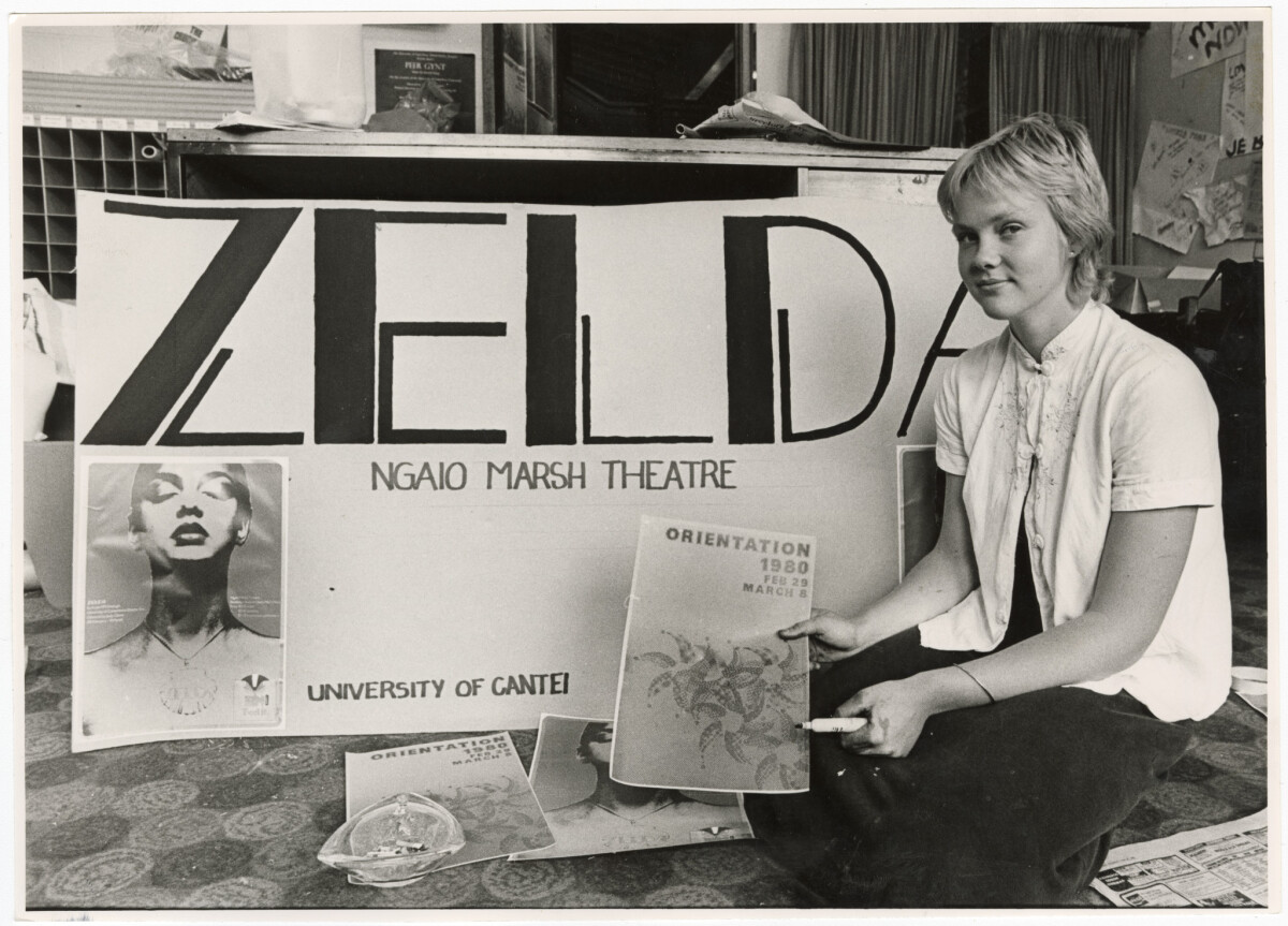 Bronwyn Croxson next to a poster for Zelda, to be held at Ngaio Marsh Theatre.
