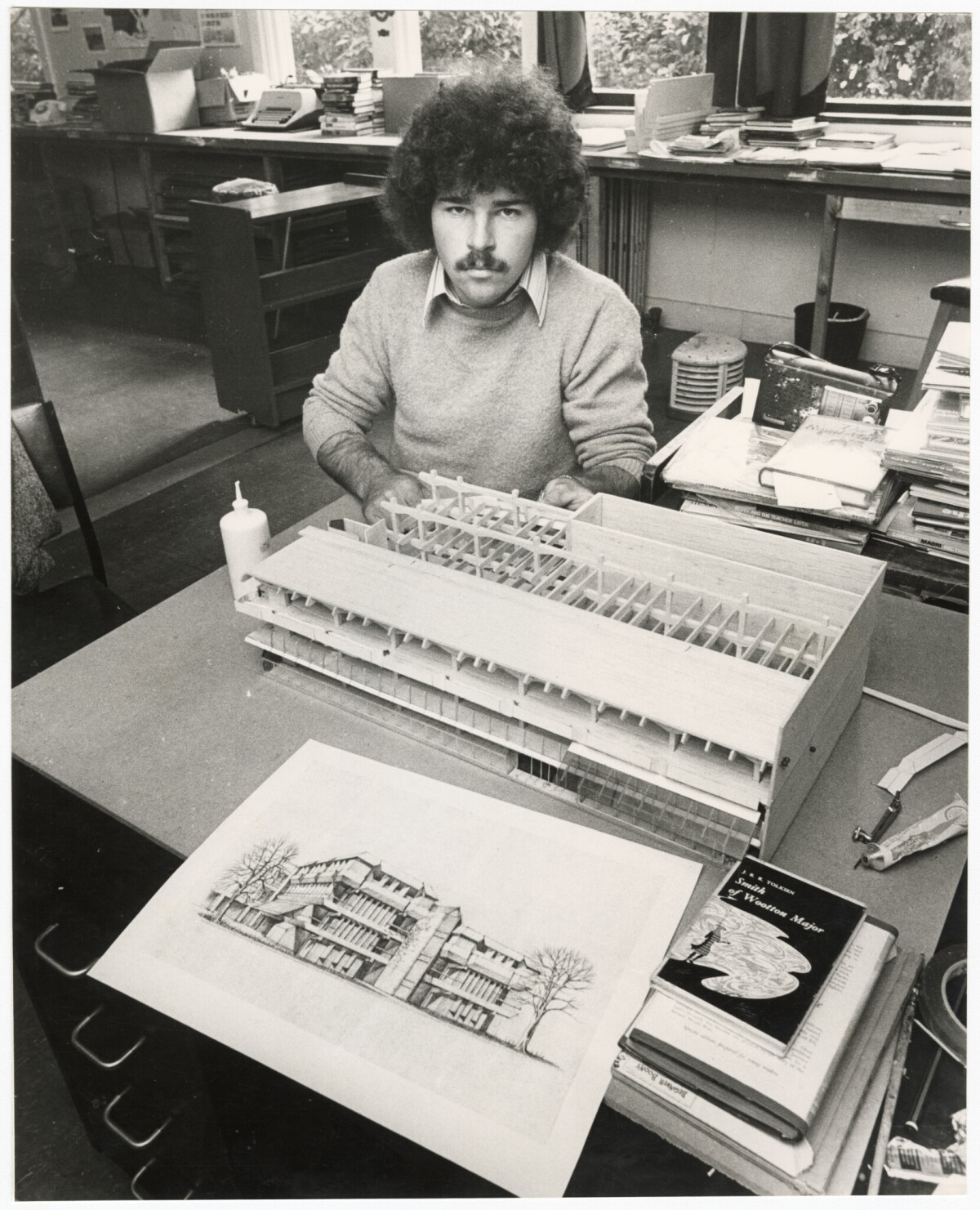 A scale model under construction of the design for the new Canterbury Public Library which will front onto Gloucester Street in central Christchurch. Constructing the model is art student from Canterbury University School of Art, John McDonald.