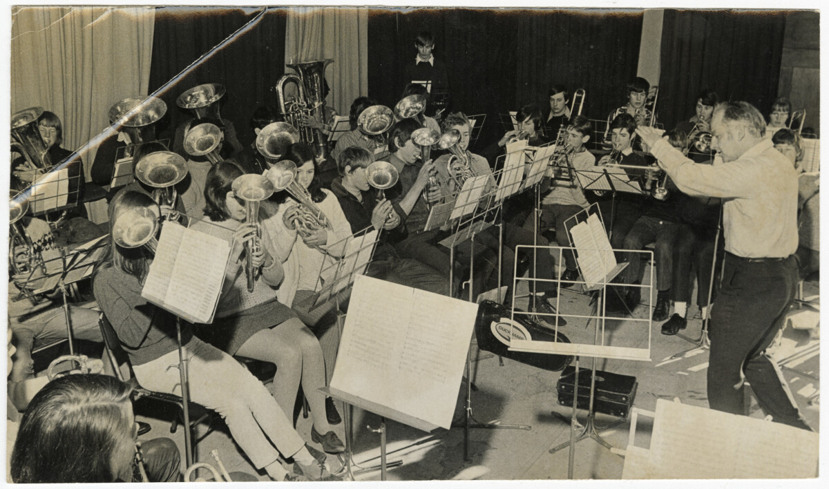 The Riccarton High School brass band practicing in their school hall being conducted by Mr Ron Young, ahead of the secondary schools' band festival.