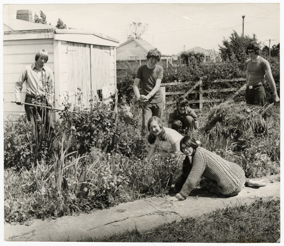A group of Riccarton High School sixth form students tidying up the garden of an elderly resident on Carmen Road during Community Week activities. Students, from left rear, Michael Todd, Roger Woods, Maurice Bromley and Glen Moreton. In front, Vivienne Hi
