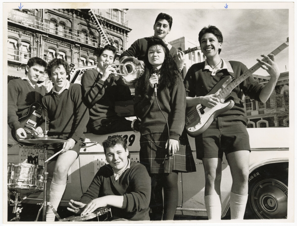 Members of the Hornby High School Band Outer Control, with their instruments ahead of a performance at Rock Quest '89 at the Theatre Royal for competing high schools. Band, from left, Glen Teasdale, Bob Kennedy, Kate Hewson, Clinton Harris, Pearl Runga and Reuben Hiku. Hamish George is seated.