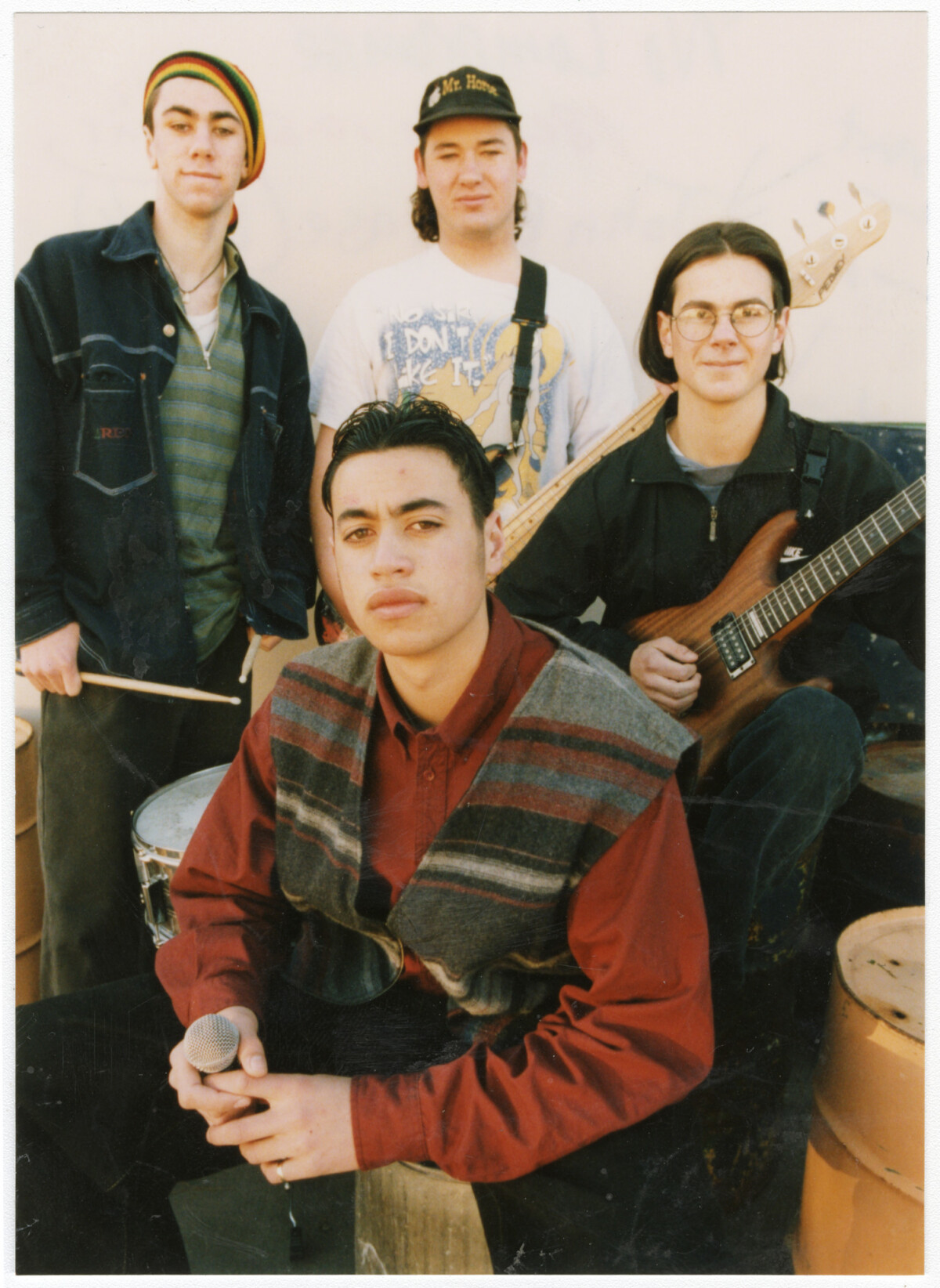 Group shot of Hillmorton High School band, No Compromise with their instruments following a competition win. Front, John Borlase (vocals), and behind him, from left Ricky Boyd (drums), Jason Mitchelmore (bass), and Michael Carpinter (guitar, back-up vocals).