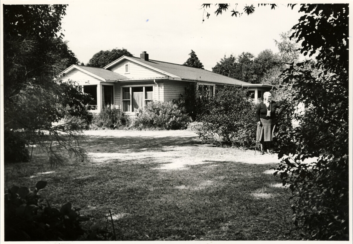 Exterior and grounds of the family home of Mrs Avice Hill on Memorial Avenue, Burnside. Mrs Hill gifted the land on her property to Waimairi District Council to run and administer a craft centre. Mrs Hill is pictured on the right hand side in the grounds.