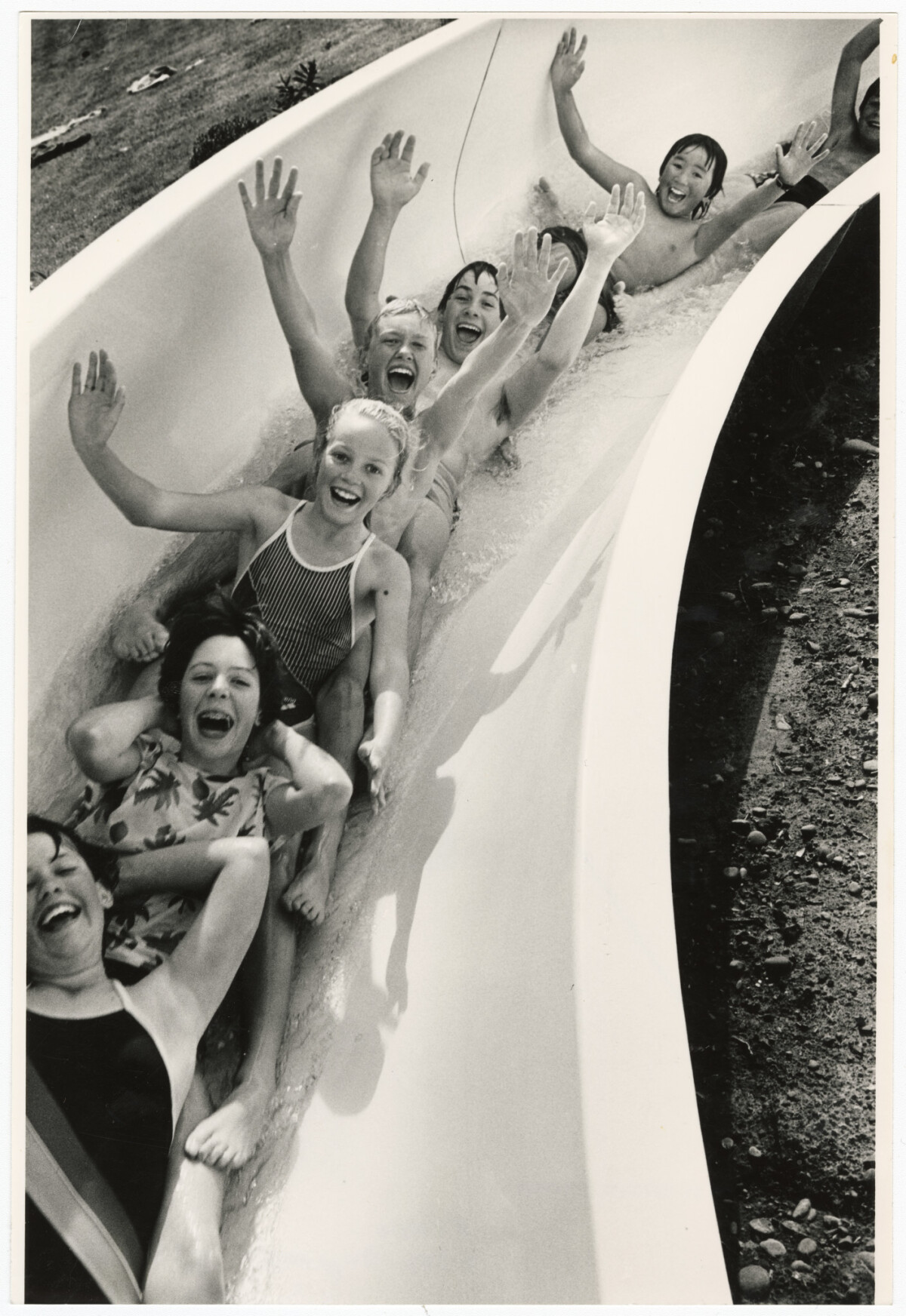 A group of first and second form pupils from Russley School going down the hydroslide together at Sockburn Park swimming pool. Pupils from top, Lincoln Chung, Nicholas Clarke, Stephen Rose, Melissa Hussey, Jacki Brewer and Melanie Knight.