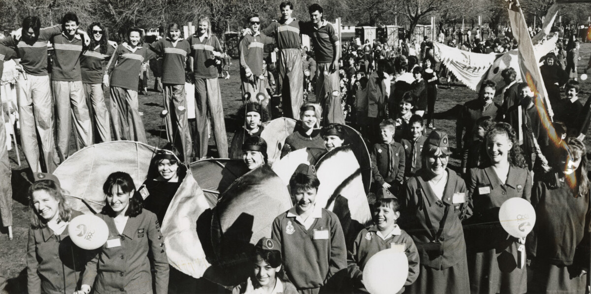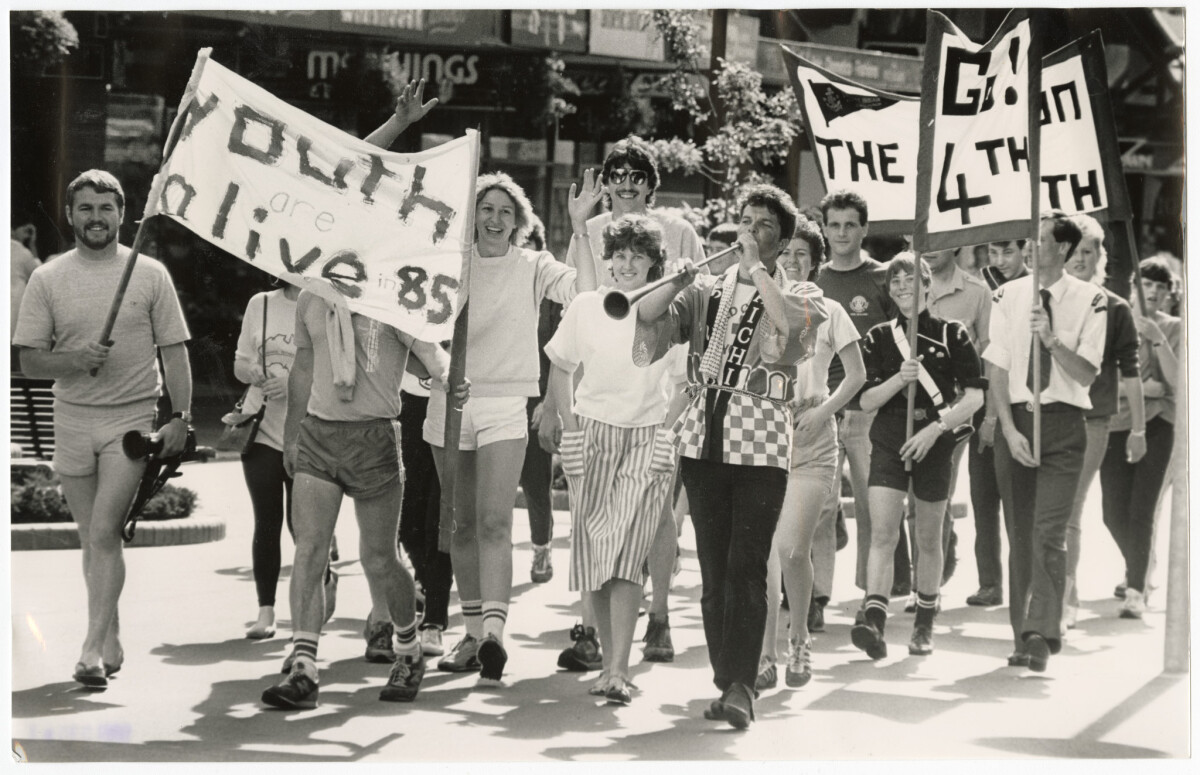 Members from youth groups marching in Cashel Mall with banners to celebrate International Youth Year. Part of the group are members of the Boys Brigade and Girl Guides.
