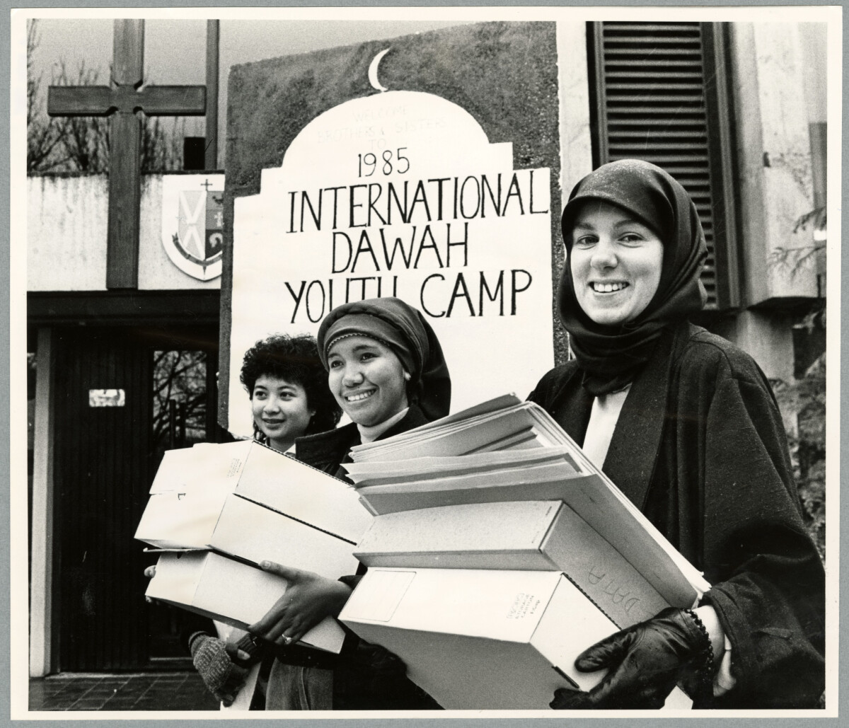 Muslim women outside the chapel at Rochester and Rutherford Hall at the University of Canterbury during International Islamic Conference in New Zealand. During the Camp the chapel was turned into a Mosque. From left, Miss Morshiha Saidin, Miss Suzana Moh