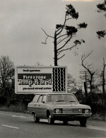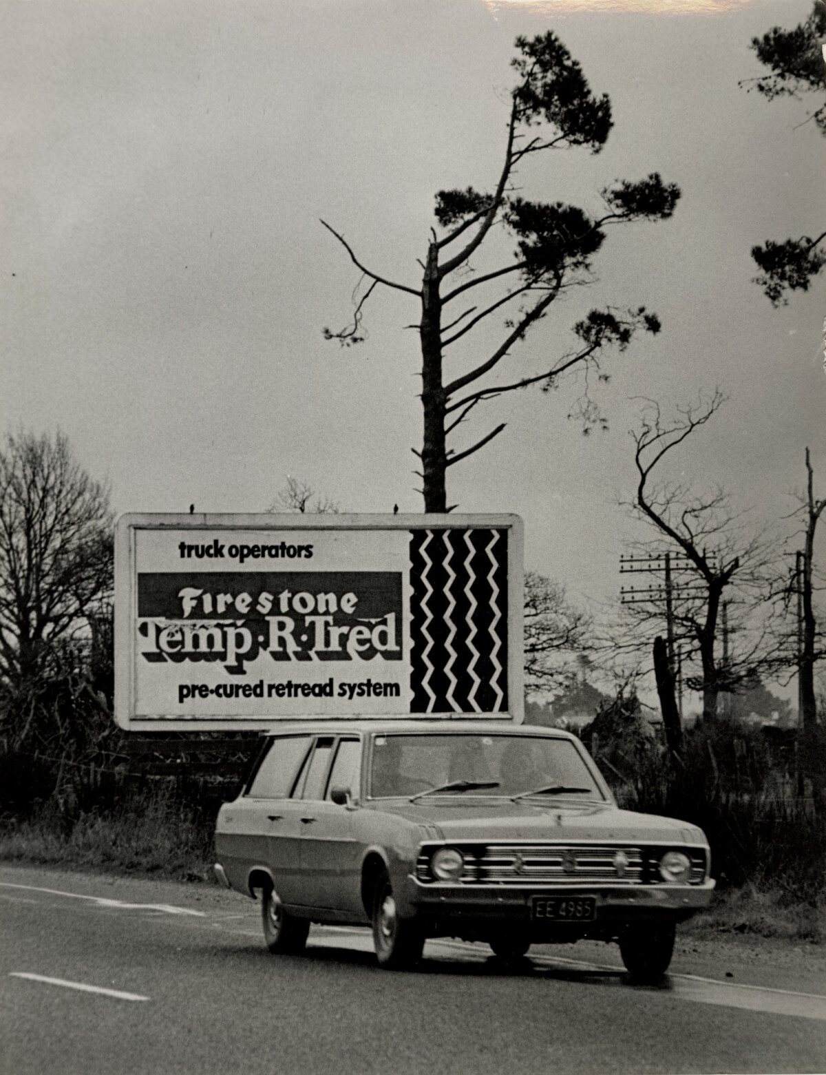 Billboard for Firestone tyres along a main road with a car passing in front.
