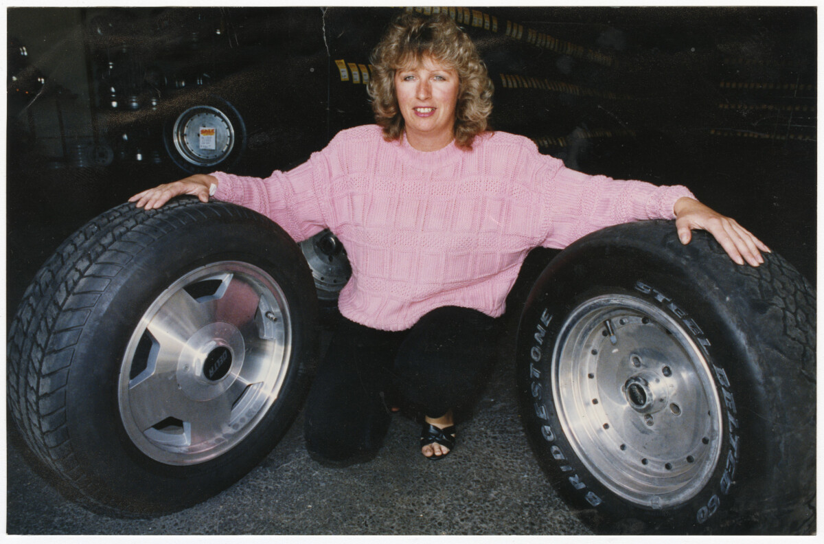 Owner of Sydenham's Budget Tyres, Deborah Milne posing with two tyres.