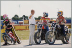 New Zealand Motorcycle Speedway rider, Ivan Mauger (standing at centre), with three racers on a racetrack.