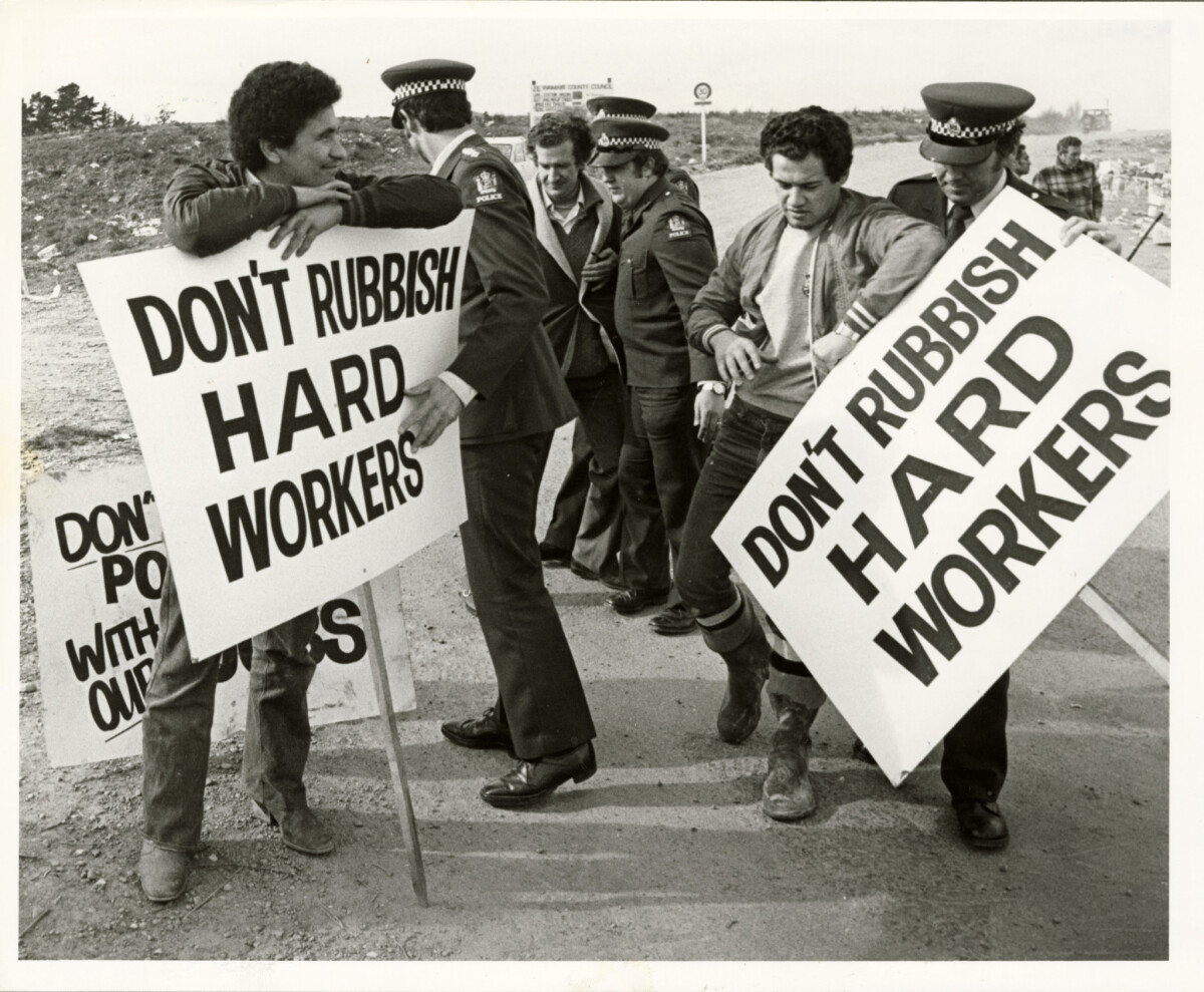 Strikers with placards on a picket line at Sawyers Arms Road dump being moved by police to allow a Mogel Bin Services truck to offload Waimairi County rubbish.