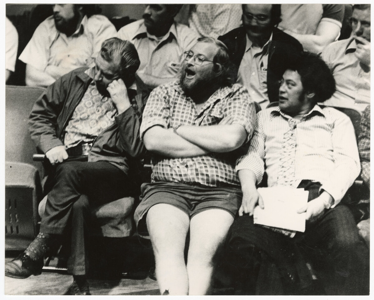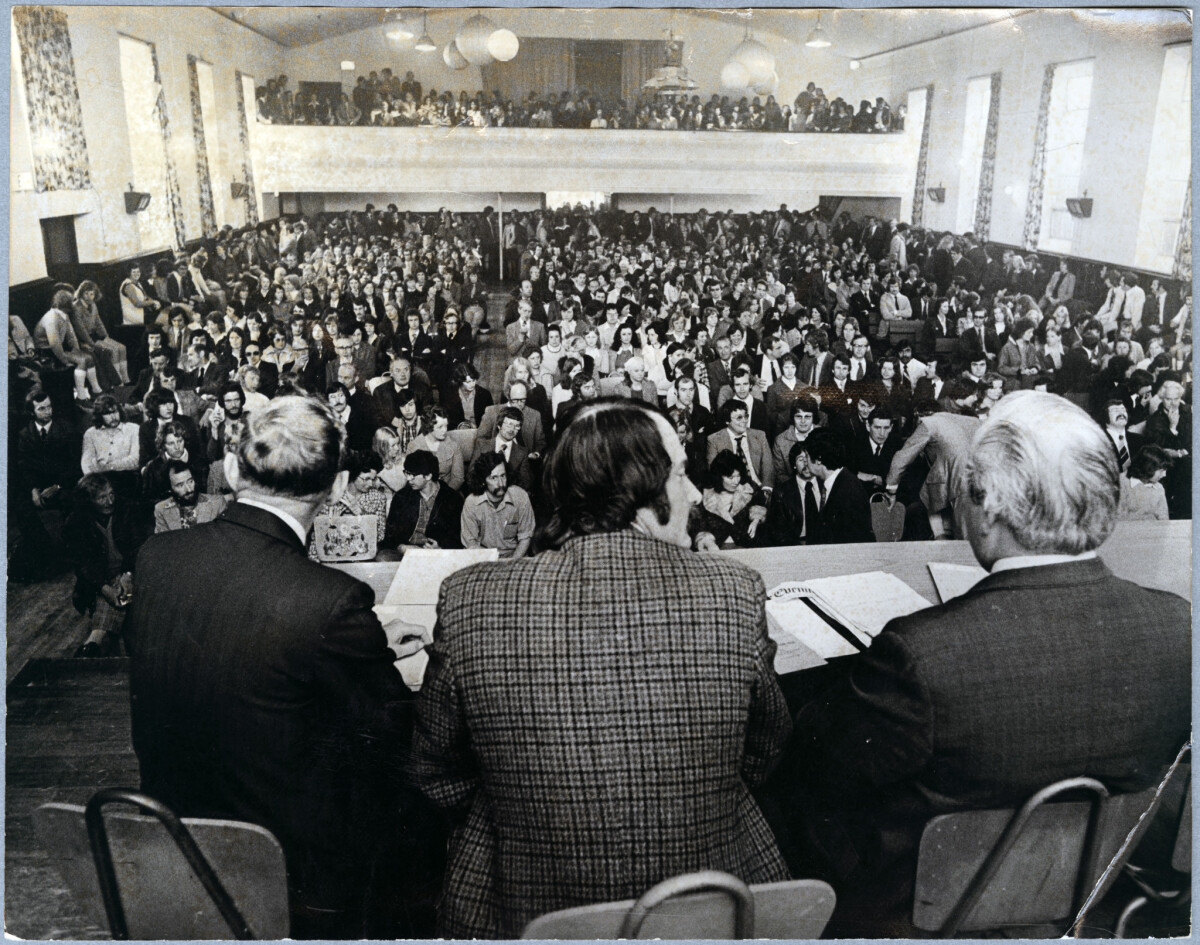 Bank staff listening to delegates at a union meeting at the Caledonian Hall discussing strike action regarding wage claims.