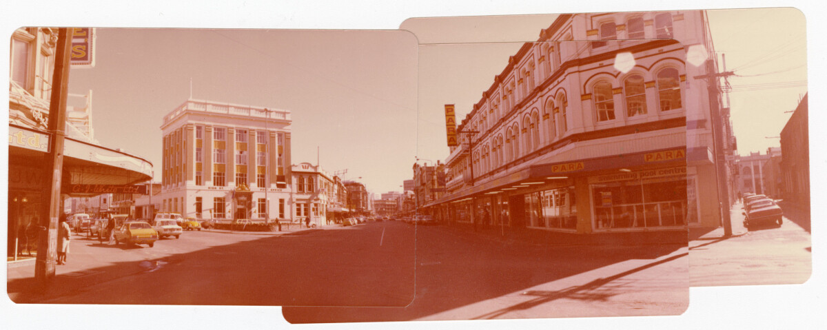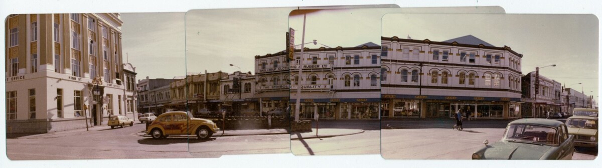 Panorama of High and Tuam St intersection looking towards Lichfield Street showing A. J. White Ltd, the High Street Post Office and Para Rubber. Poplar Street is also visible on the right.