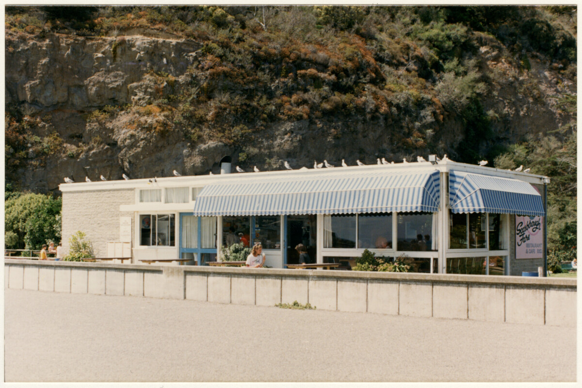 Exterior of the Scarborough Fair Restaurant and Café at 147 Esplanade in Sumner next to Scarborough beach. A row of seagulls are sat along the top of the building.