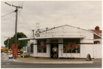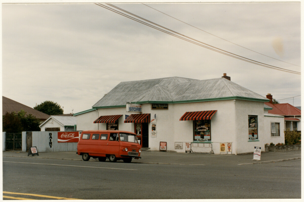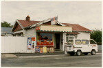 Exterior of the Tahere Food Mart at 325 Bealey Avenue on the corner with Champion Street in Edgeware. Advertising for Coca Cola is painted on the wall facing Champion Street.