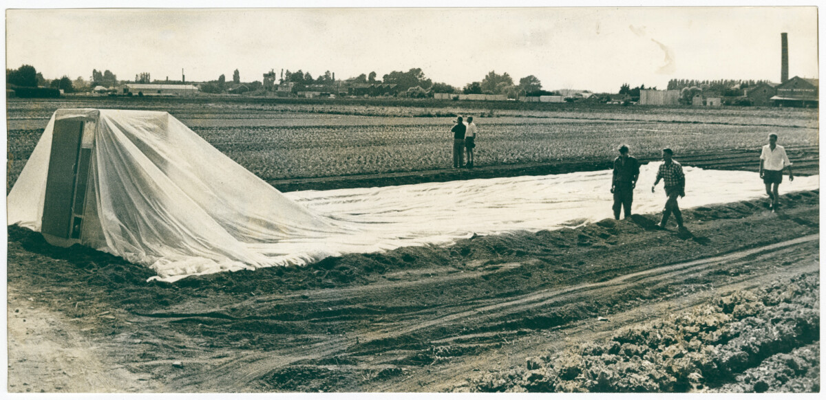 View of fields at farmland belonging to vegetable growers in Belfast. In the centre a plastic inflatable hot house is in the process of being inflated.